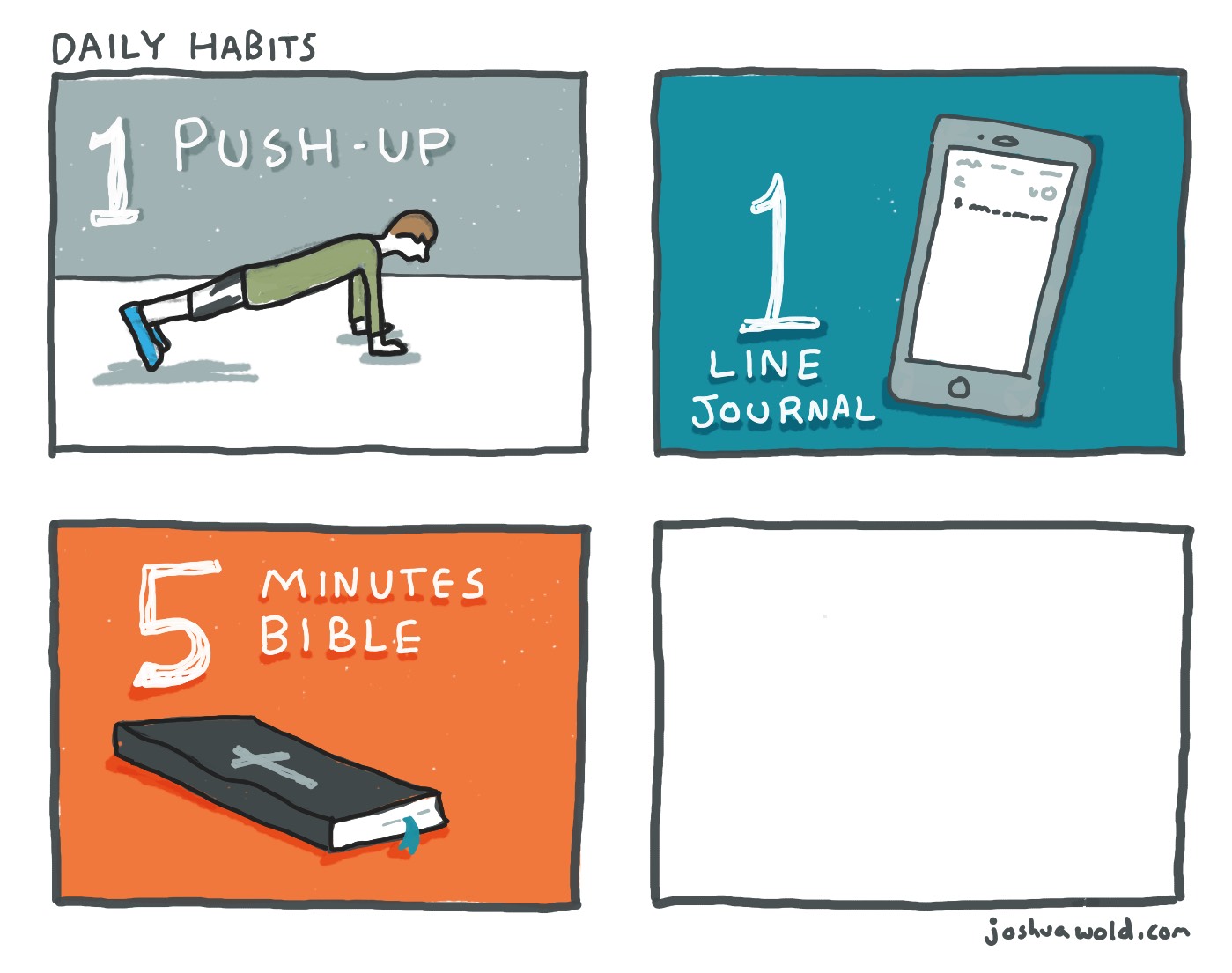Push-ups, 1 line journaling, and 5 minutes of reading my Bible have now become habit for me. I don't feel that my day is complete unless I can check them off.