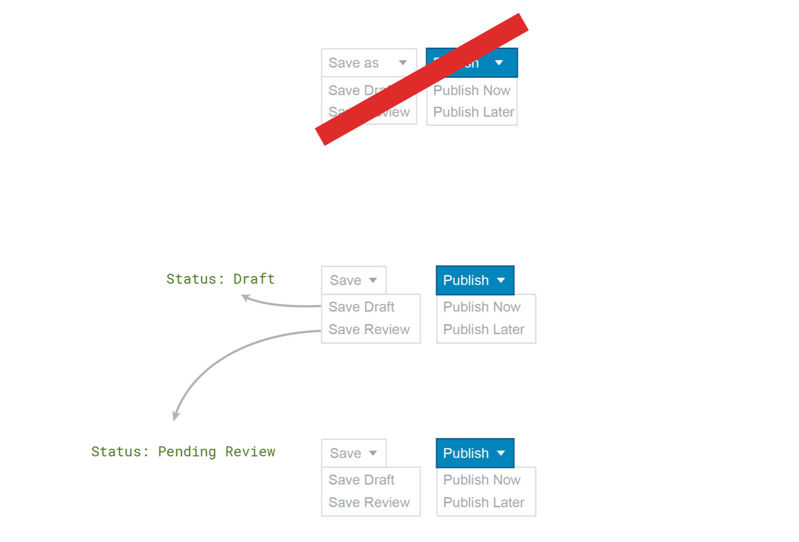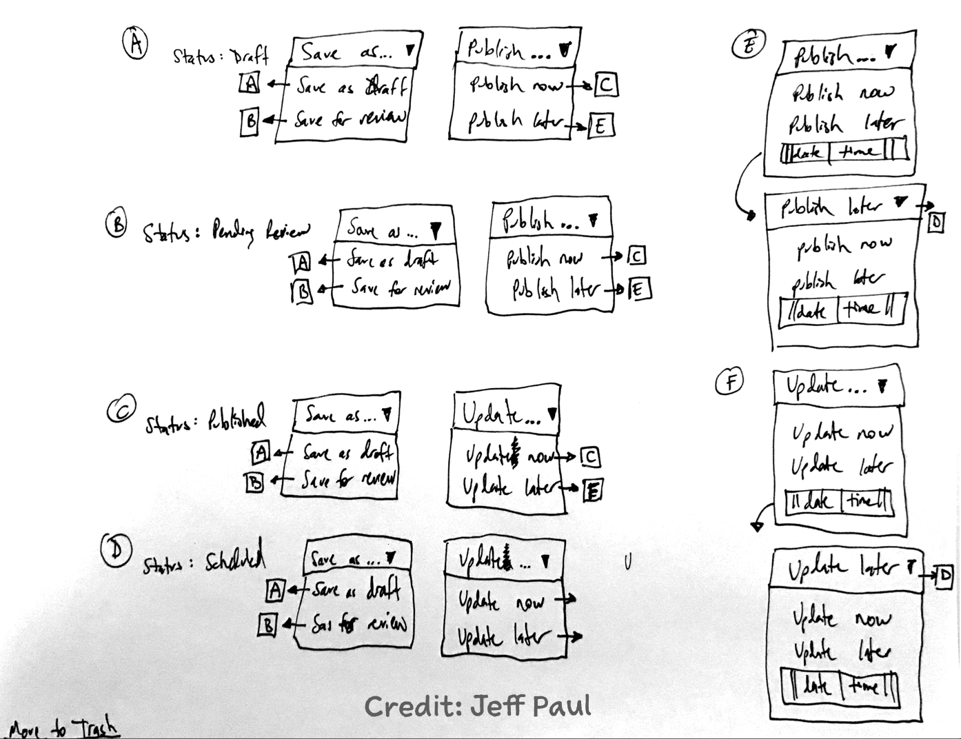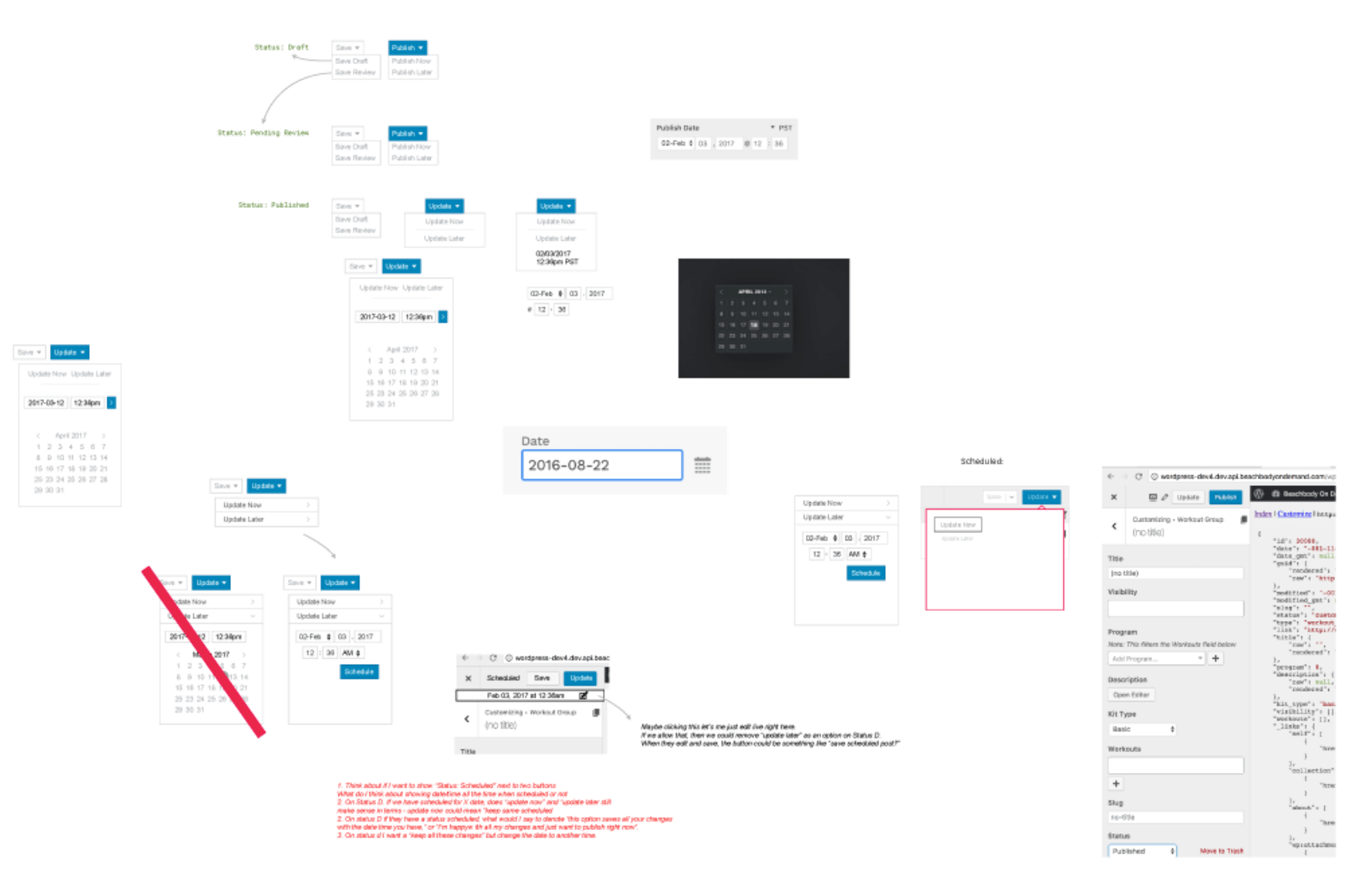 From there I kept playing with ideas, based on feedback from the team, with attempts to simplify things and make sure that the flow made sense for a user trying to manage the status of a post.
