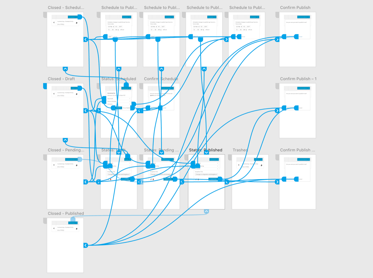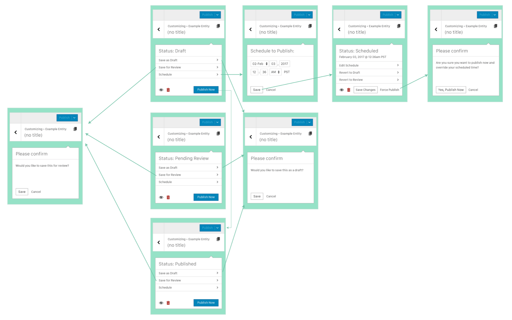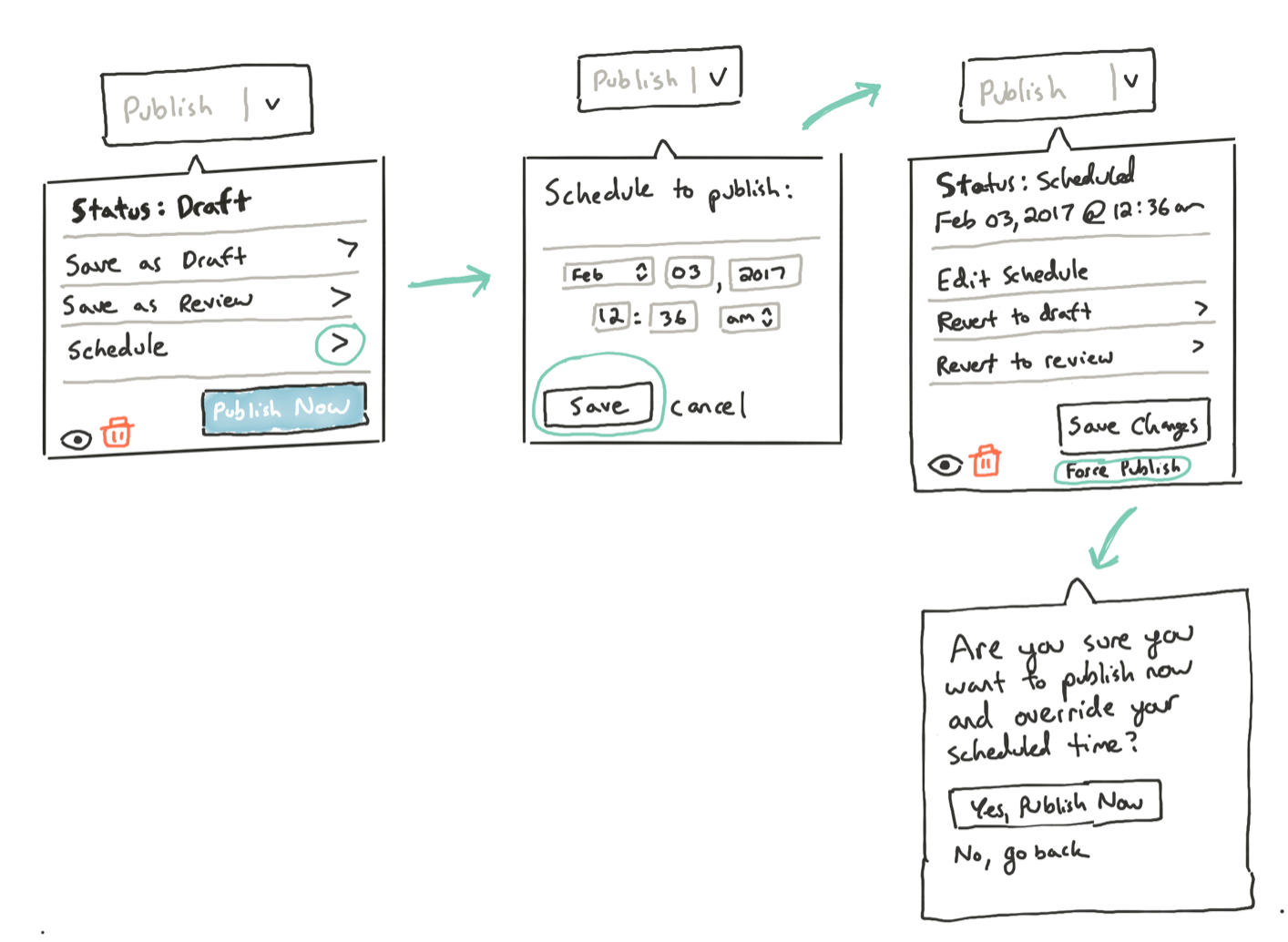 From there I kept playing with ideas, based on feedback from the team, with attempts to simplify things and make sure that the flow made sense for a user trying to manage the status of a post.
