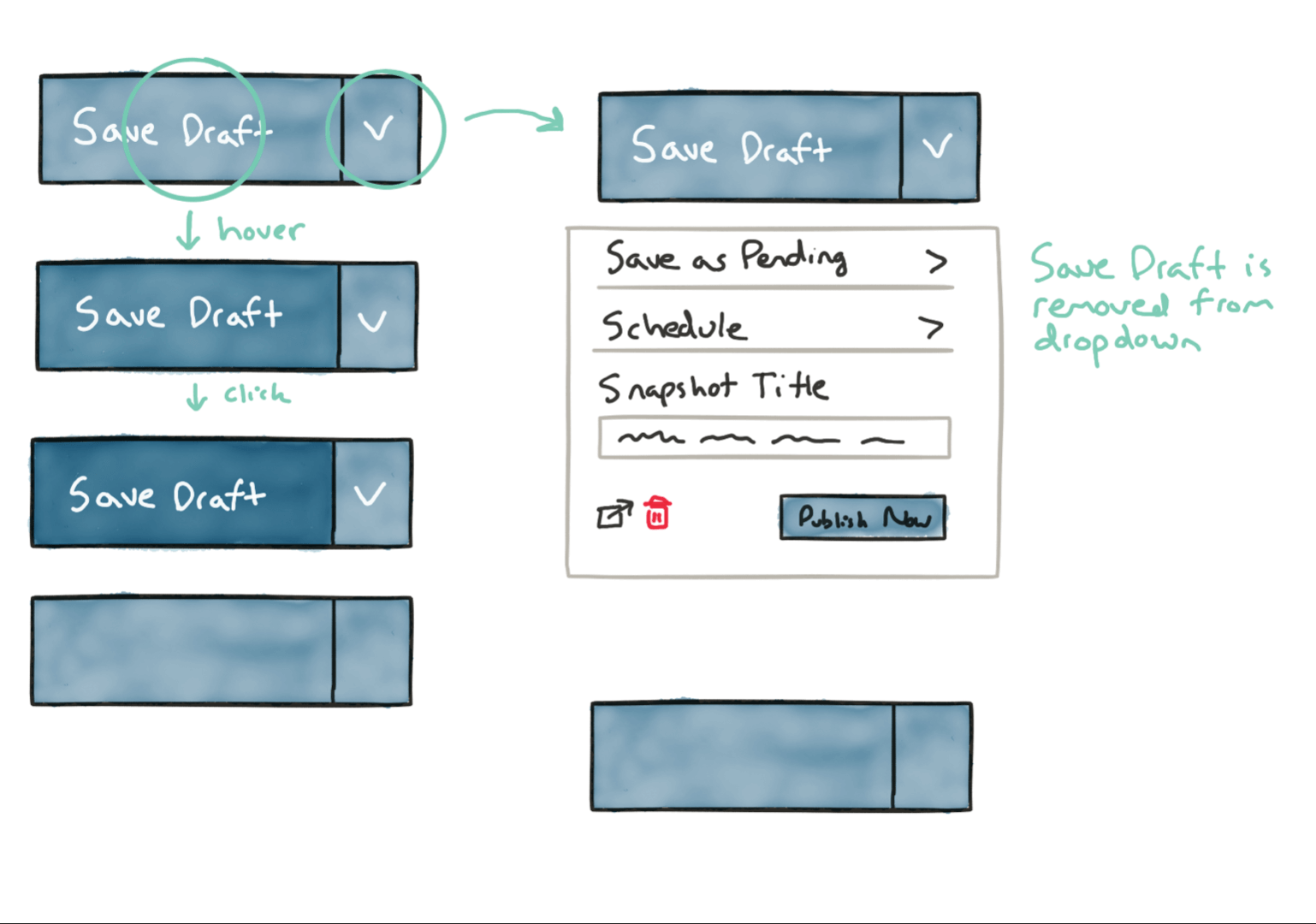 The project started for me when my teammate reached out with a sketch, proposing some initial ideas for where we could take the flow for saving and publishing. We hopped on a call together and talked through this flow. From there I created a sketch to followup and simplify my understanding of the interface.